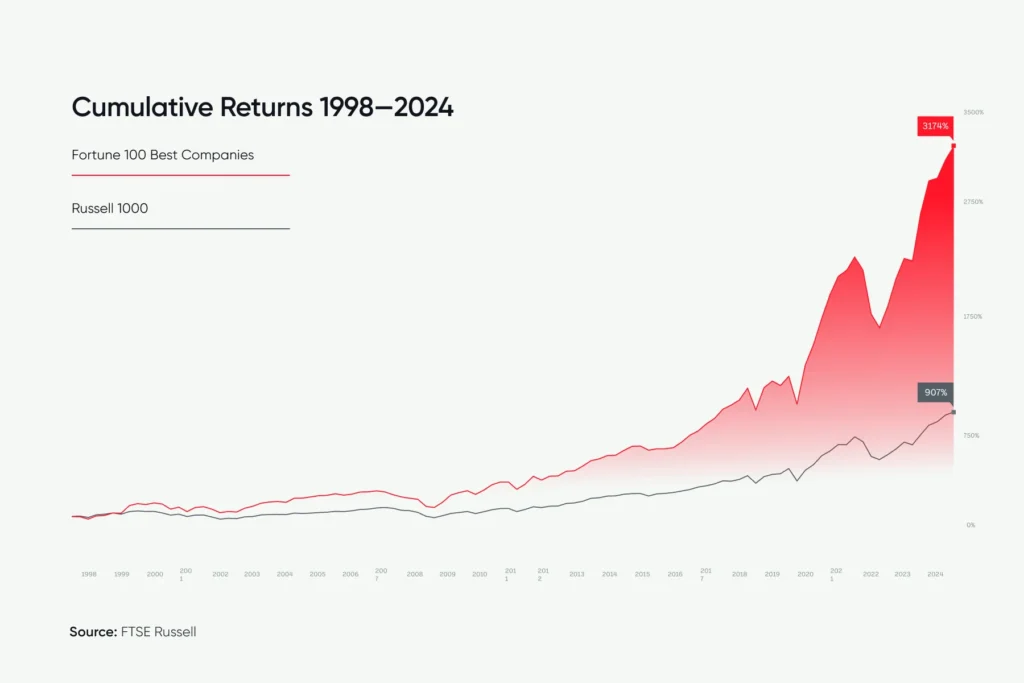 Companies listed on the Fortune 100 Best Companies to Work For, compiled by Great Place To Work, outperform the stock market by nearly four times.