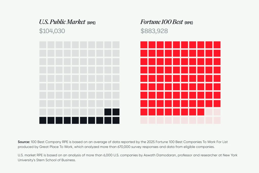 Companies on the Fortune 100 Best earned 8.5 times as much revenue per employee (RPE) as the U.S. market.